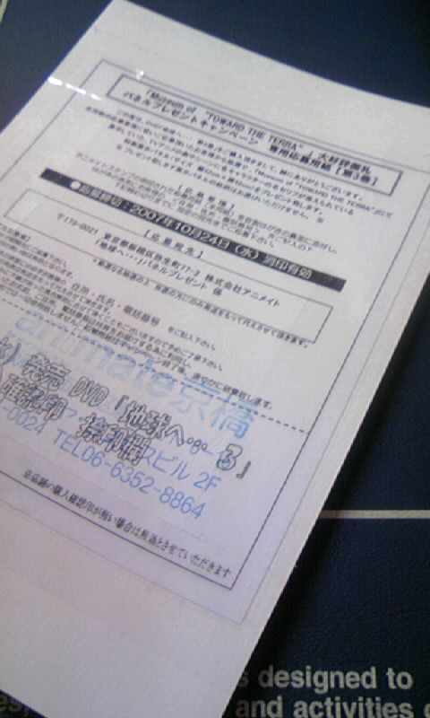 5人も来てくれたのに、その5人は本番来れないらしい。 本番誰が来てくれるんだろう。。。心配。 練習ではほとんど何も言われず…。 休憩時間。 シュークリームやらカントリーマアムやら食べながら雑談とか。 トルコ相撲部(?)の話やら(←グラウンドで油を被ってやる相撲らしい) 19フレットハーモニクスの謎も解けた。 終わってからさらに雑談会。 ハンターとかの話が出たのに遠くて聞こえない。 でも見つめてくる部員たち。 先輩:「HUNTER×HUNTER……」 部員:(じー) 先輩:『銀魂………』 部員:(じー) 青葉:「そんな名で見るなよ!!」 帰りにアニメイトに寄って地球のDVDゲット。 バイタチ買うの忘れた。 OVAファンディスク買おうかな……(ポスター……) 帰宅。 10時に倒れたので8時半起き。(ラジオ聞き逃し) 起きてアニメを見る。 ▼彩雲国 子安さん………うひゃー(なんだそれは) カッコいいけどーあー(なんだ) 鳥海さんは最後まで分からんかった。 ▼BLUE DRAGON ジーロのぱんつはブリーフ派らしい(予告より) …衝撃の事実! ▼REBORN! ランボさんが可愛くて困る(きゃ) 雨戦で壊されたステージが復活しててビビった。 ▼デルトラ ※注意※ 今日のブログ記事の「ジョミー」とは「デイン」のことです。 やっぱりジョミーが王族だった!! ジョミーしかいないと思い続けていた私。 だって今日の放送ジョミー映り過ぎでしょ! しかもアイキャッチもジョミー!! (※「ジョミー」とは「デイン」のことを指します) あああ! ジョミーがさらわれた!! 何やってるんだよリーフ! ……ああそうかソルジャーが出るんだね!(違う) ジョミーは来週出るのか…?ソルジャーは…?(しつこいな) 昼までネット徘徊。 画像の保存とか調べつつ。 昼ご飯の後また寝る。 起きたら5時。 おうちプリント実践(修学旅行の) 割にうまく出来た。 最近の機械はすごいね!(オイ) 友人に渡す分とかアルバムにしとく分とか印刷。 一応ネットアルバムあるし。 晩ご飯。 その後ダンス楽曲編集。 ……疲れた。 2日間の日記おしまい。 2007/11/11(Sun) 23:49:26